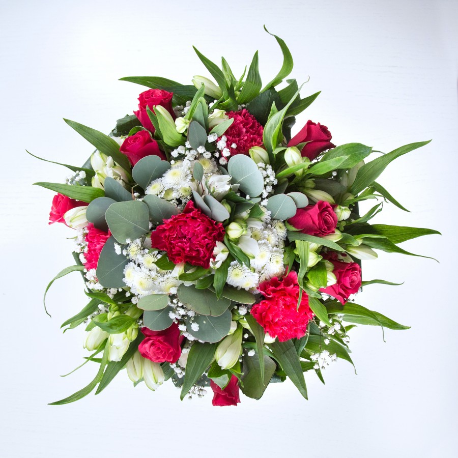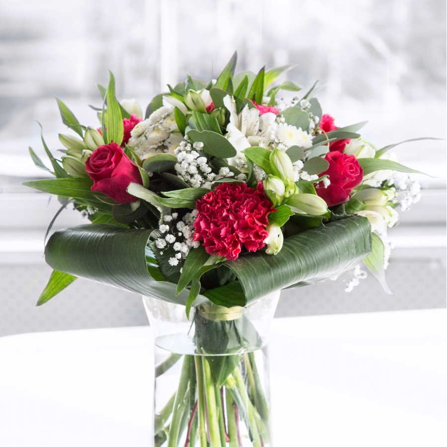 - Artful Design: Enhanced with red roses, carnations, white alstroemeria, and aspidistra leaves for a balanced look.