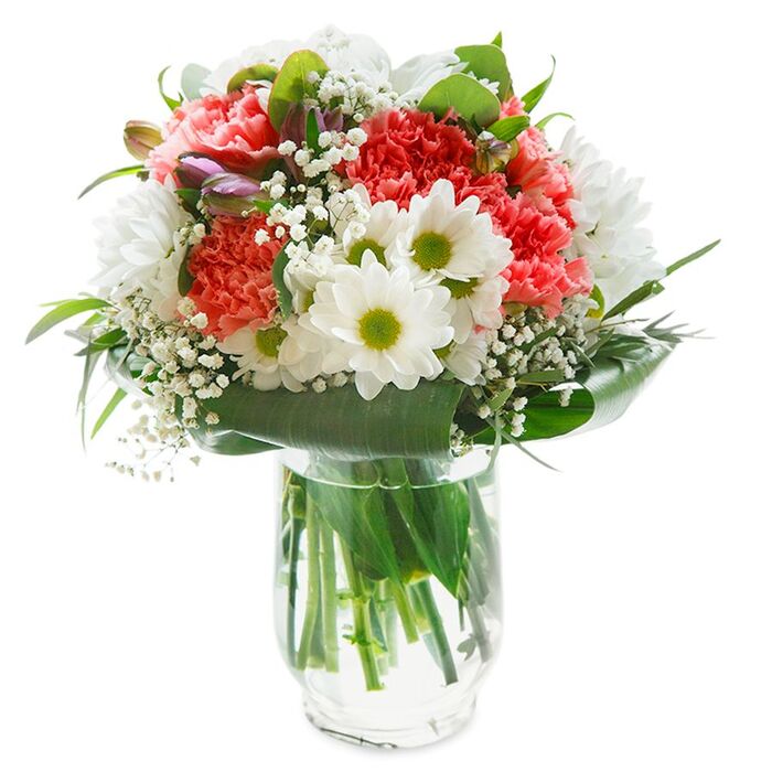 A celebration of colour and freshness radiates from this bouquet, presented upright in a brilliant white gift bag ready for heartfelt gifting across Willesden. Coral, peach, and scarlet carnations gather at the heart, their ruffled textures recalling the vibrancy of flower stalls near Willesden Market on a sunny day. Scattered throughout, pristine white daisies with bright, citrus-green centers spark a joyful, uplifting energy, complemented by sprigs of feathery gypsophila that lend an airy grace and innocence. Among the lush blooms, a few slender purple-tinged buds peer out, hinting at the seasons of change and growth familiar to Willesden residents. Framing the bouquet, wide and glossy green leaves create a natural embrace, grounding the exuberant petals and providing visual depth. The entire composition is captured against a pure white background, emphasizing every nuance of colour and detail crafted by experienced local florists. Satin ribbon handles complete the practical elegance of the bag, making this arrangement ideal for delivering smiles on a birthday or congratulatory occasion within NW10. Every element speaks of care and joyful artistry-a bouquet designed to bring both comfort and delight to someone special in Willesden. This radiant bouquet, meticulously arranged by a Willesden florist and inspired by the local vibrancy of NW10, captures the soft radiance of springtime renewal. At its heart stand jubilant white daisies-crisp petals and lively lime centers glowing with cheerful simplicity. Coral-pink carnations unfurl their plush, ruffled layers in joyful abundance, while delicate baby's breath dances among the blooms, creating a sense of movement and airy fullness reminiscent of the gentle breezes near Gladstone Park. Blush-tinted alstroemeria buds and slender leaves peek through, infusing the bouquet with subtle colour harmony and a hint of emerging promise. Cool eucalyptus and deep green foliage encircle the flowers, adding both fragrant freshness and visual grounding. The arrangement is intentionally circular and balanced, echoing the sense of community and embrace so often felt in Willesden. It evokes joy, optimism, and heartfelt connection-perfect for marking a special birthday, congratulating a loved one, or simply brightening a home near Willesden High Road. The bouquet's colours, forms, and textures celebrate the art of local floristry, inviting all who see or receive it to experience a moment of serenity, delight, and the warmth of expertly crafted flowers. A sweep of coral-pink carnations and pristine white daisies springs from a clear glass vase, capturing that uplifting, welcoming spirit so familiar across Willesden. The carnations, each one luxuriously ruffled, impart an energetic core to the bouquet, their lively colour reminiscent of neighbourhood celebrations on Park Parade or warm afternoons at Gladstone Park. Crisp white chrysanthemums, layered around, provide a sense of balance and clean elegance, their soft golden-green centers offering a subtle flash of brightness. Sprays of soft baby's breath float amidst the main blossoms, infusing the composition with gentle airiness and suggesting a lightness that immediately soothes. The arrangement is ringed by a rich collar of glossy green foliage-some broad and sheltering, others slender and scattered-drawing the eye upward while anchoring the design. A handful of unopened magenta alstroemeria buds nestle on one side, hinting at growth and renewal. The bouquet's stems are visible through the crystal-clear water in the vase, lending a wholesome, freshly gathered feel directly from Willesden's best florists. Illuminated by bright, even lighting, each detail of petal, leaf, and stem is sharply revealed, with no shadows to detract. This bouquet radiates pure joy and serenity, ideal for brightening a kitchen table, sending encouragement, or creating a gentle, thoughtful moment for someone special in Willesden.